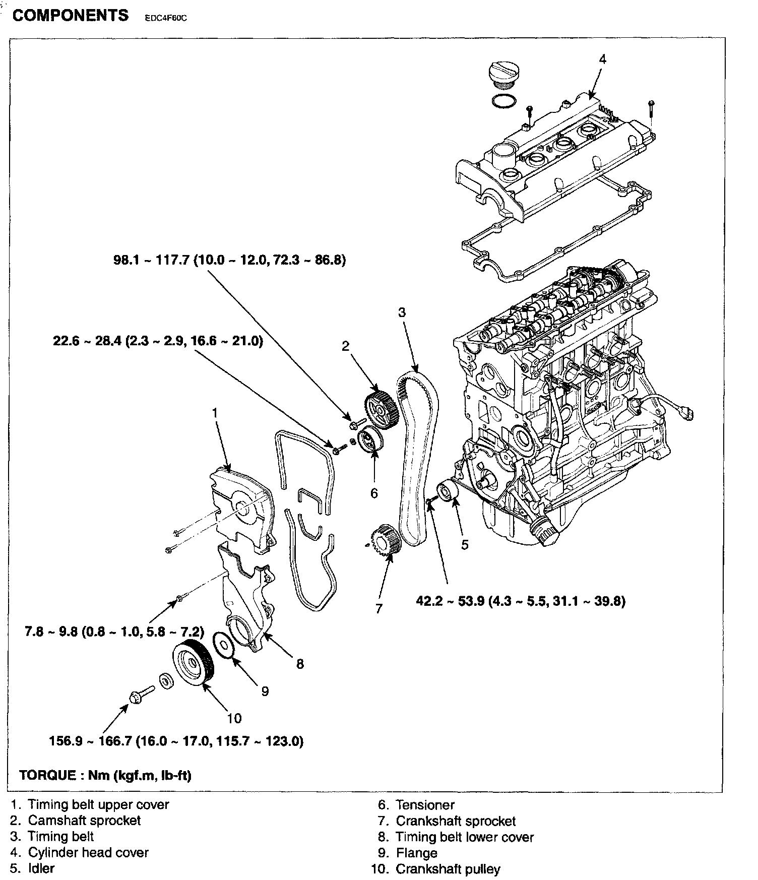 Timing belt cover bolt 7.8 - 9.8 Nm (0.8 - 1.0 kgf.m, 5.8 - 7.2 lb-ft)