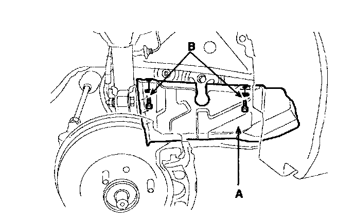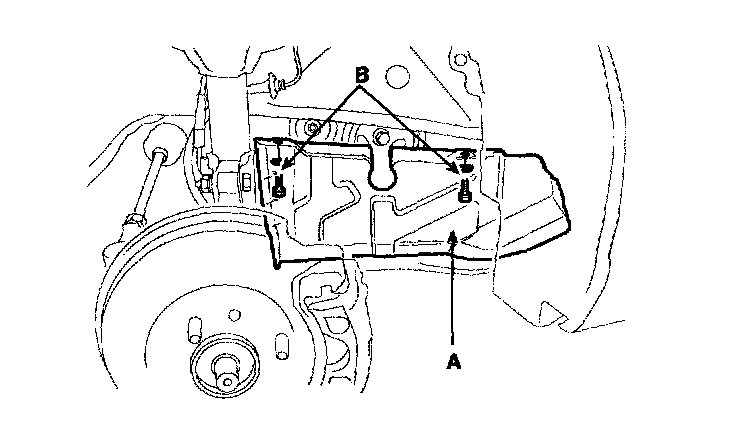 14. Remove the 5 bolts (B) and timing belt lower cover (A).