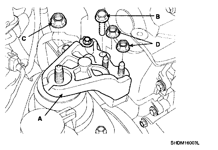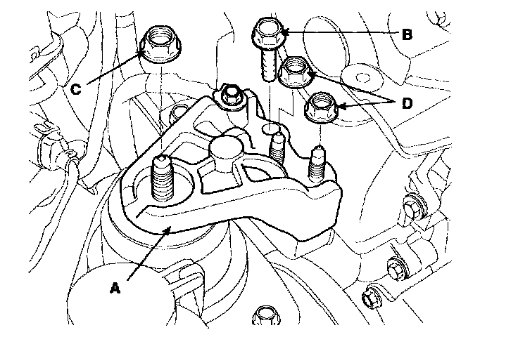 2) Remove the bolt (B), three nuts (C, D) and engine mount bracket (A).