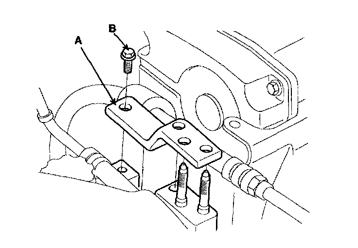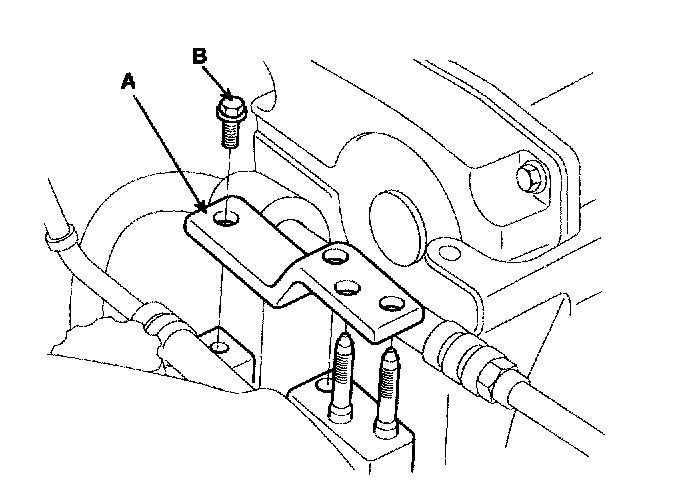 2) Install engine mount bracket (A) with the three nuts (C, D) and bolt (B).