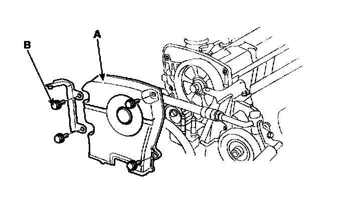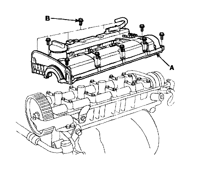 16. Install the timing belt upper cover (A) with the four bolts (B).