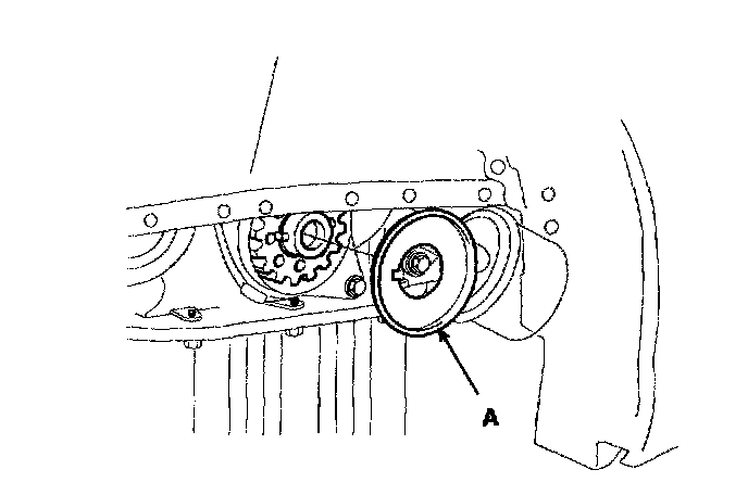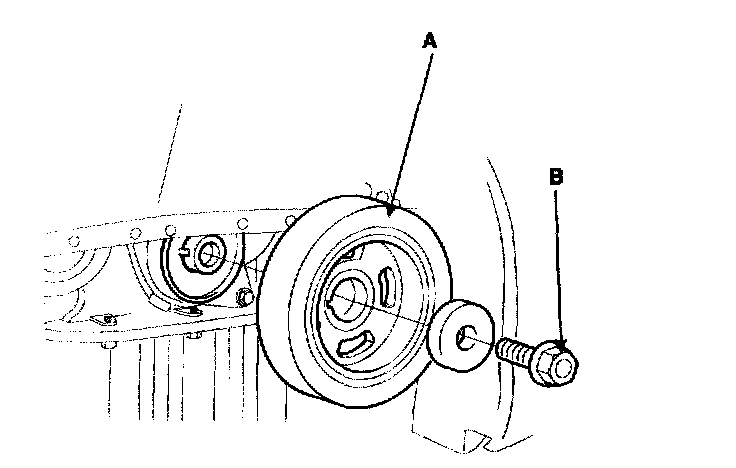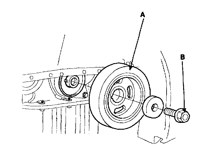 12. Remove the crankshaft pulley bolt (B) and crankshaft pulley (A). (B).