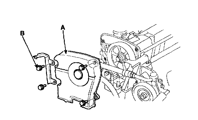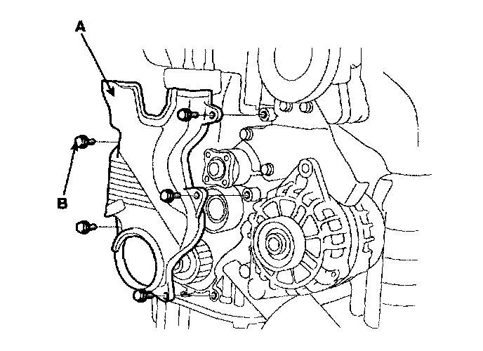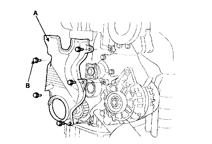 10. Remove the four bolts (B) and timing belt upper cover (A).
