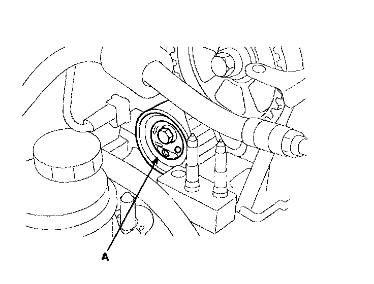 5. Install the idler pulley (A) and tighten the bolt (B) to the specified torque.