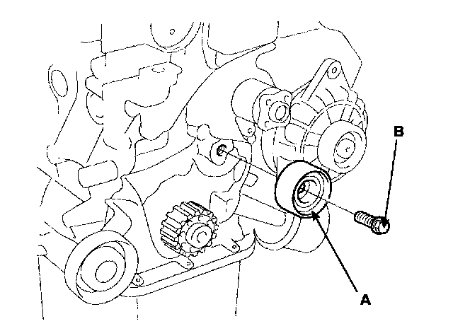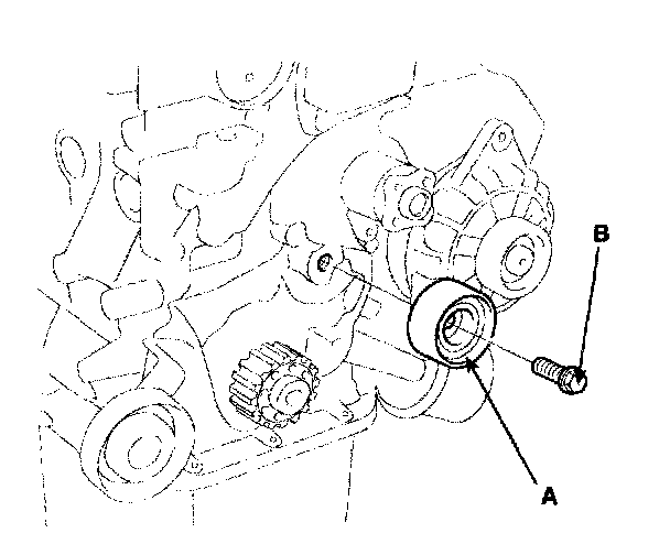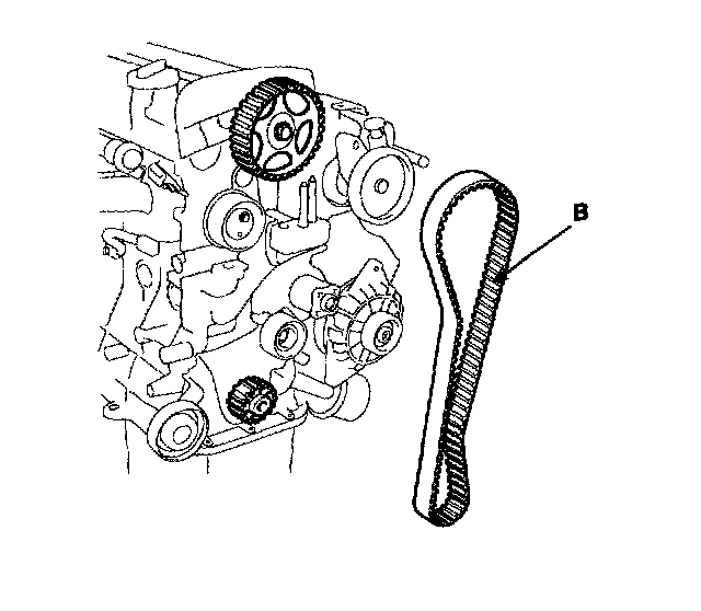 15. Remove the timing belt tensioner (A) and timing belt (B).