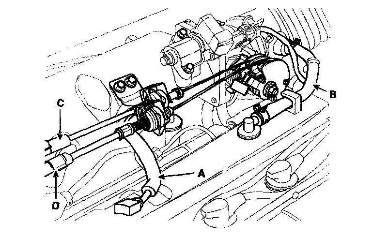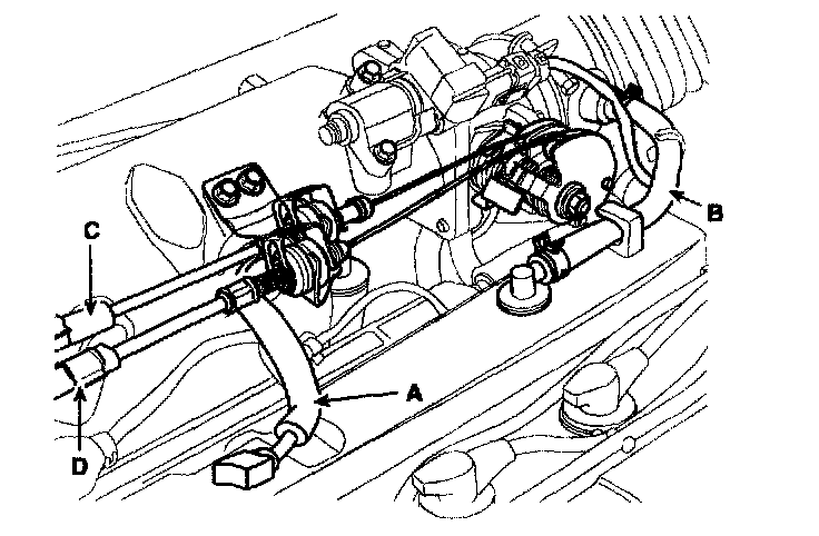 3) Install the accelerator cable (C) and the auto cruise cable (D) from the cylinder head cover.