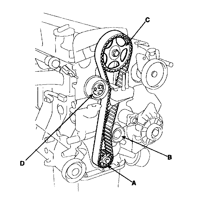 7. Belt so as not give slack at each center of shaft. Do as following procedures when installing timing belt. Crankshaft sprocket (A) - Idler pulley (B) Camshaft sprocket (C) - timing belt tensioner. (D). (The tensioner can be installed after the timing belt.)