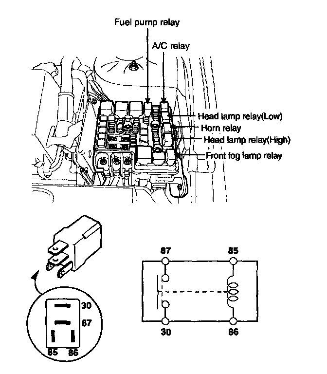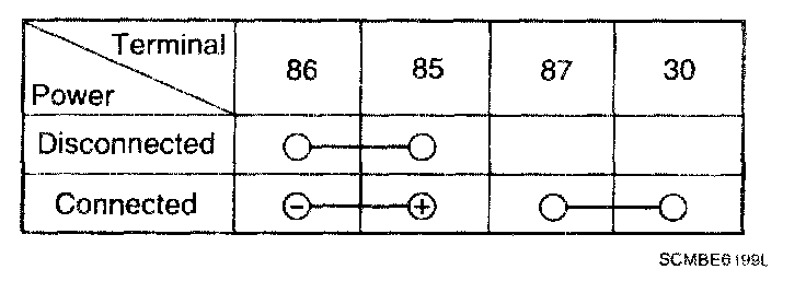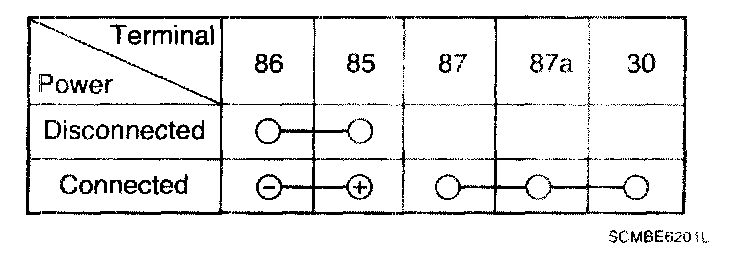 1. There should be continuity between the No.30 and No.87 terminals when power and ground are connected to the No.85 and No.86 terminals.