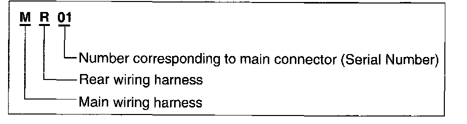 A connector identification symbol consists of a wiring harness location classification symbol corresponding to a wiring harness location and number corresponding to the connector.
