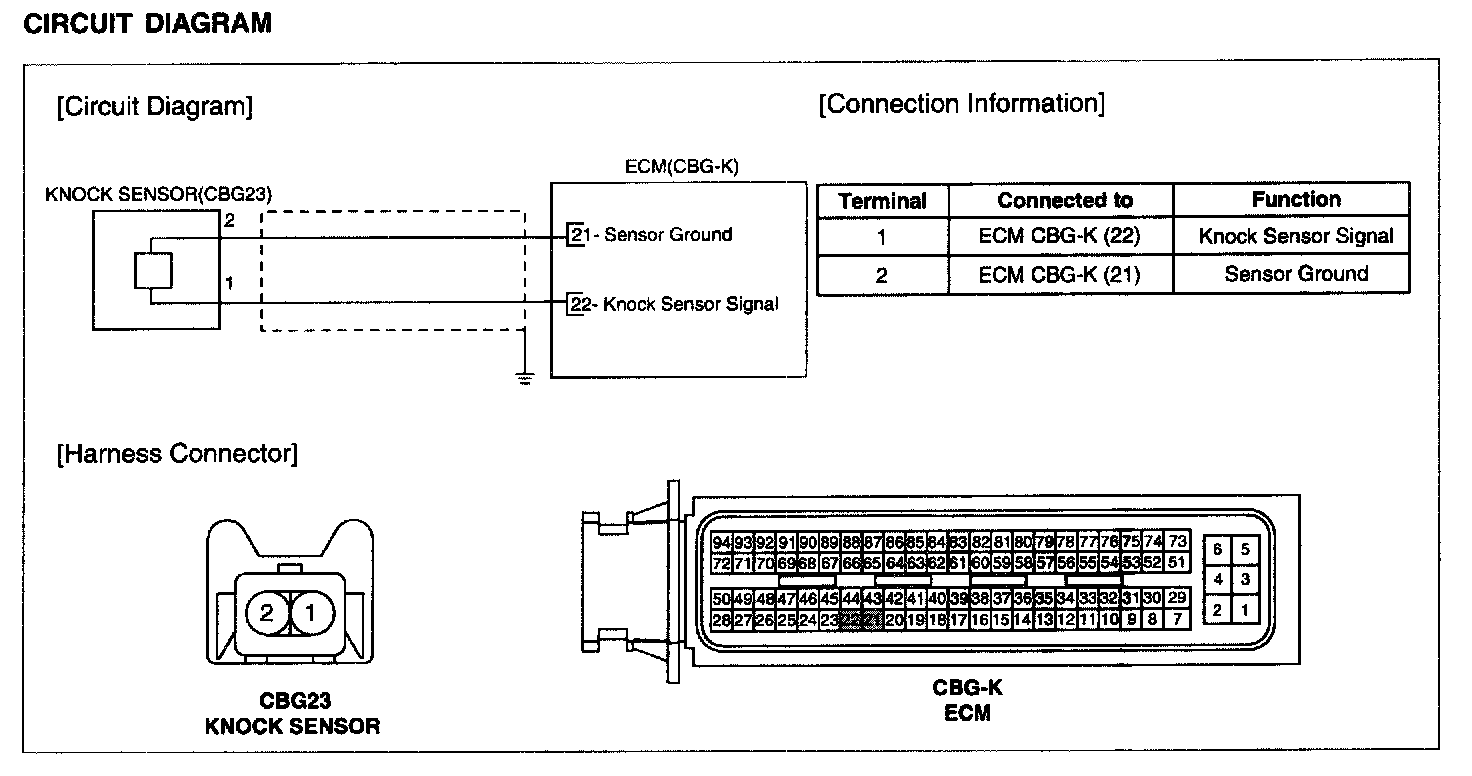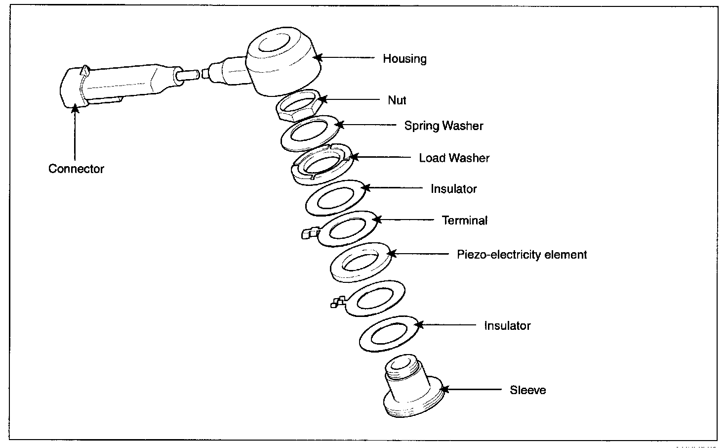 Knocking is a phenomenon characterized by undesirable vibration and noise and can cause engine damage. Knock Sensor (KS) senses engine knocking and the cylinder block. When knocking occurs, the vibration from the cylinder block is applied as pressure to the piezoelectric element. At this time, this sensor transfers the voltage signal higher than the specified value to the ECM and the ECM retards the ignition timing. If the knocking disappears after retarding the ignition timing, the ECM will advance the ignition timing. This sequential control can improve engine power, torque and fuel economy.