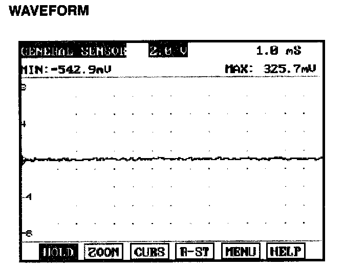 The knock sensor is installed at cycliner block to detect the vibration effectively during engine running. The above waveform shows the signal waveform of knock sensor when knock doesn't happen. Generally, knock signal has more noise than other sensor.