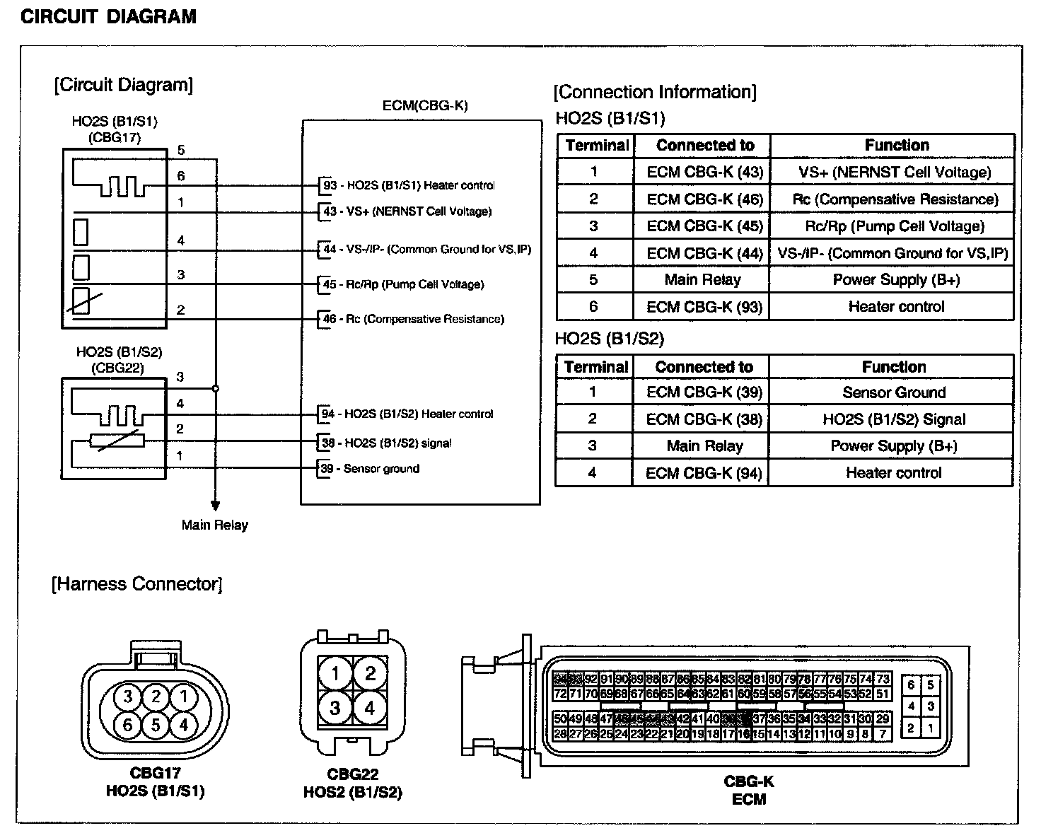 Heated Oxygen Sensor (HO2S) consists of zirconium and alumina and is installed on upstream and downstream of the Manifold Catalyst Converter (MCC). After it compares oxygen consistency of the atmosphere with the exhaust gas, it transfers the oxygen consistency of the exhaust gas to the ECM. In order that this sensor normally operates, the temperature of the sensor tip is higher than 370 °C (698 °F). So it has a heater which is controlled by the ECM duty signal. When the exhaust gas temperature is lower than the specified value, the heater warms the sensor tip.