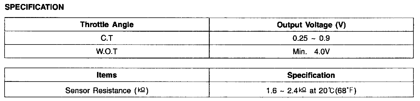 The Throttle Position Sensor (TPS) is mounted on the throttle body and detects the opening angle of the throttle plate. The TPS has a variable resistor (potentiometer) whose characteristic is the resistance changing according to the throttle angle. During acceleration, the TPS resistance between the reference 5 V and the signal terminal decreases and output voltage increases; during deceleration, the TPS resistance increases and TPS output voltage decreases. The ECM supplies a reference 5 V to the TPS and the output voltage increases directly with the opening of the throttle valve. The TPS output voltage will vary from 0.2 - 0.8 V at closed throttle to 4.3 - 4.8 V at wide-open throttle. The ECM determines operating conditions such as idle (closed throttle), part load, acceleration/deceleration, and wide-open throttle from the TPS. Also The ECM uses the Manifold Absolute Pressure Sensor (MAPS) signal along with the TPS signal to adjust fuel injection duration and ignition timing.