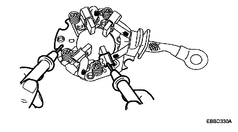 Check for continuity between the (+) side brush holder and brush holder base. If there is continuity, replace the holder assembly.