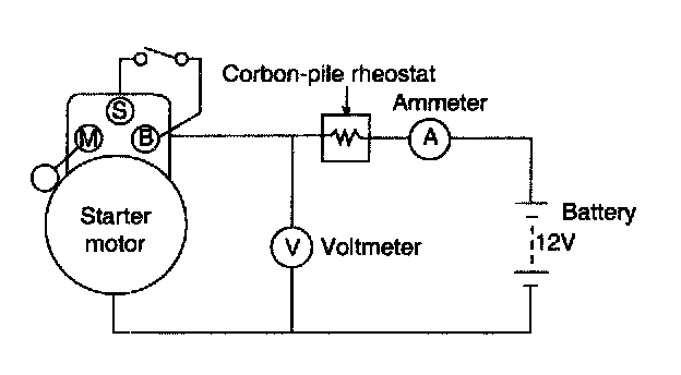 2. After adjusting the rheostat until the battery voltage shown on the voltmeter reads 11.5 volts, confirm that the maximum amperage draw is within the specifications and that the starter motor turns smoothly and freely.