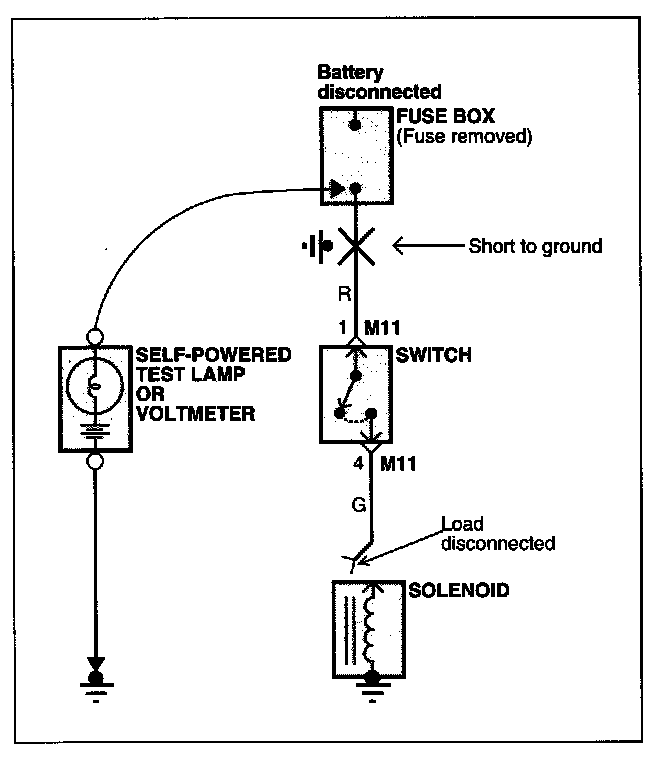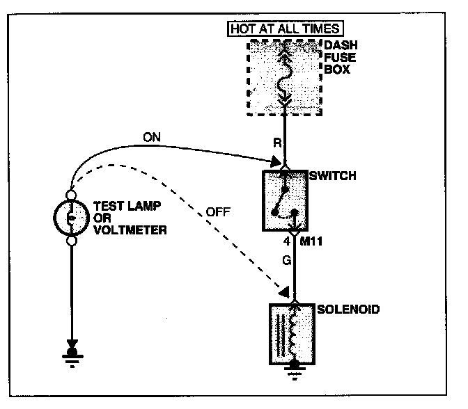 A. Connect one lead of a test lamp or voltmeter to a ground. If you are using a voltmeter, be sure it is the voltmeter's negative test lead you have connected to ground.