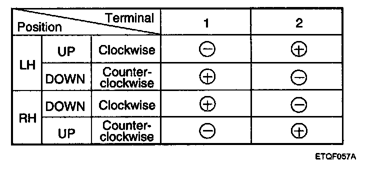 3. Connect the motor terminals directly to battery voltage (12 V) and check that the motor operates smoothly. Next, reverse the polarity and check that the motor operates smoothly in the reverse direction. If the operation is abnormal, replace the motor.
