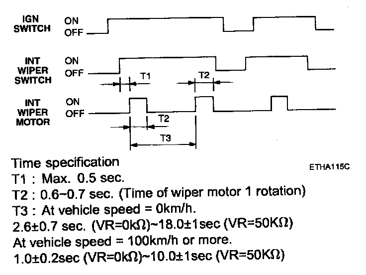 When Ignition 2 is on and the wiper switch is in the intermittent position, the wiper shall operate with speed dependant intermittent time. A single wipe is achieved by driving the wiper relay until the park switch is able to take over unless the dwell time between wipes is too short. In this case it would be on all the time. This avoids unnecessary clicking of the wiper relay.