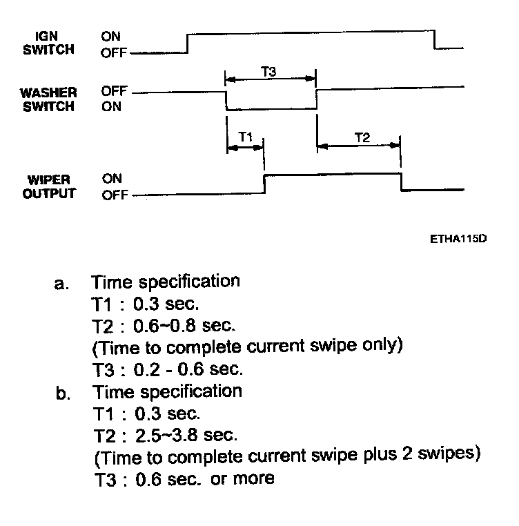 If the washer switch is on for more than 0.2 but less than 0.6 sec, then wiper performs a single swipe. Alternatively, if the washer switch is held for more than 0.6 s then the wipers must finish the current swipe the perform another two swipes.