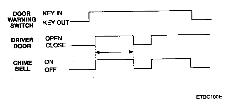 If the key is in ignition key cylinder and the drivers door is opened, the chime bell sounds. This tone is the same as the seatbelt warning chime and over speed warning chime. The chime sound is generated with a 800 Hz drive, amplitude modulated with an exponentially decaying envelope of time constant 1 ± 0.25 seconds. If the door is closed or the key is removed, the chime stops immediately.