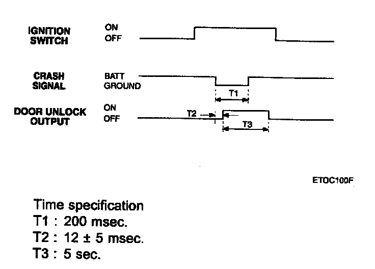 If IG1 is on and a crash signal is received, send an unlock pulse to the door locks. Unlock signal must occur within 12 ± 5 msec after crash signal is received. Unlock pulse is 5 sec period. If crash unlock is not used in a particular variant then the crash input is to be left floating.