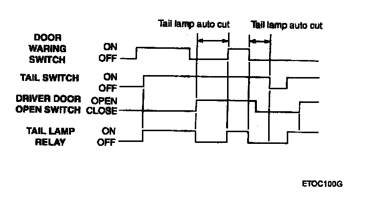 When key is in the ignition key cylinder and tail lamp switch is on, followed by removing key from ignition and then opening of the drivers doors will turn off the tail lamp relay. If driver door is opened first, followed by removing key from ignition, then tall lamp is switched off.