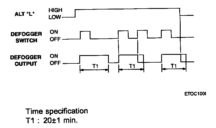 When the engine is running (Alternator "L" is high) a contact of the rear defog switch (momentary action) will switch the relay output on for 20 minutes duration.