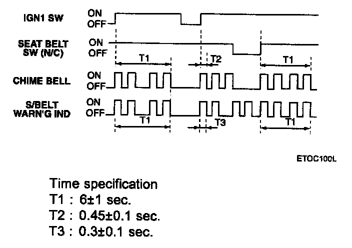 Whenever the ignition 1 is turned on the seat belt warning chime is sounded for total time 6 seconds, with period 0.9 sec and duty rate 50 %. It is silenced immediately if the seat belt is sensed as fastened.