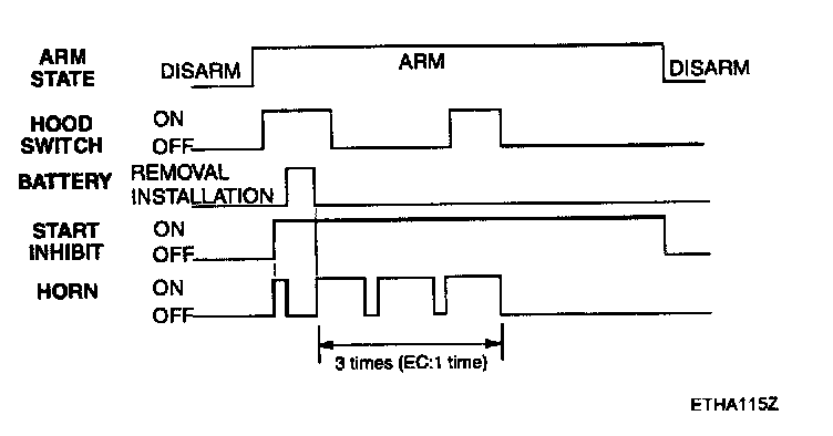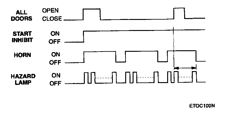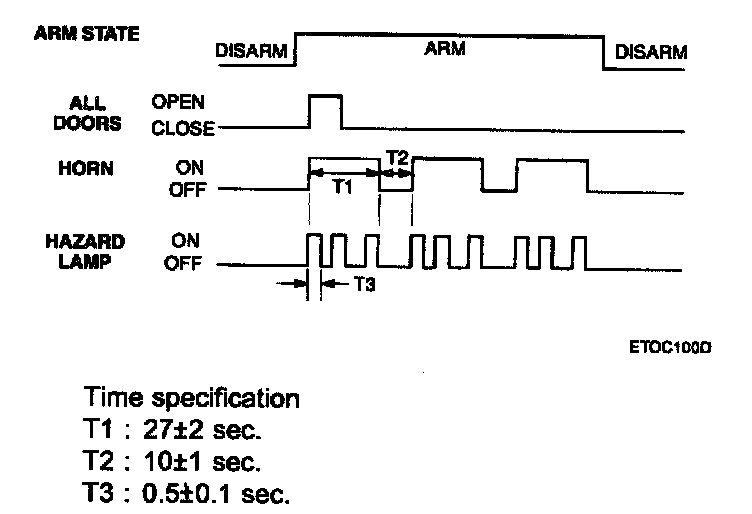 This system enters the armed state if it is in the prearmed state and, after 0.6 sec, check actuator lock and each door, hood and tail gate close, and no door warning switch (no key in ignition). On entering the arm state, a single flash of the hazard lamps is given, period of cycle 2 second, duty rate 50 %.