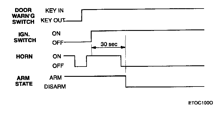 After the alarm state or start inhibit state are entered, if door warning switch on (key in ignition) & IGN2 ON, if IGN2 state is changed to OFF within 30 sec, remain in alarm state.