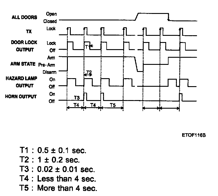 If transmitter lock signal is received and then a subsequent press of the remote key lock button within 4 seconds will result in a horn sounding for 20 ms ± 10 ms duration. The function is disabled in the pre-arm state: