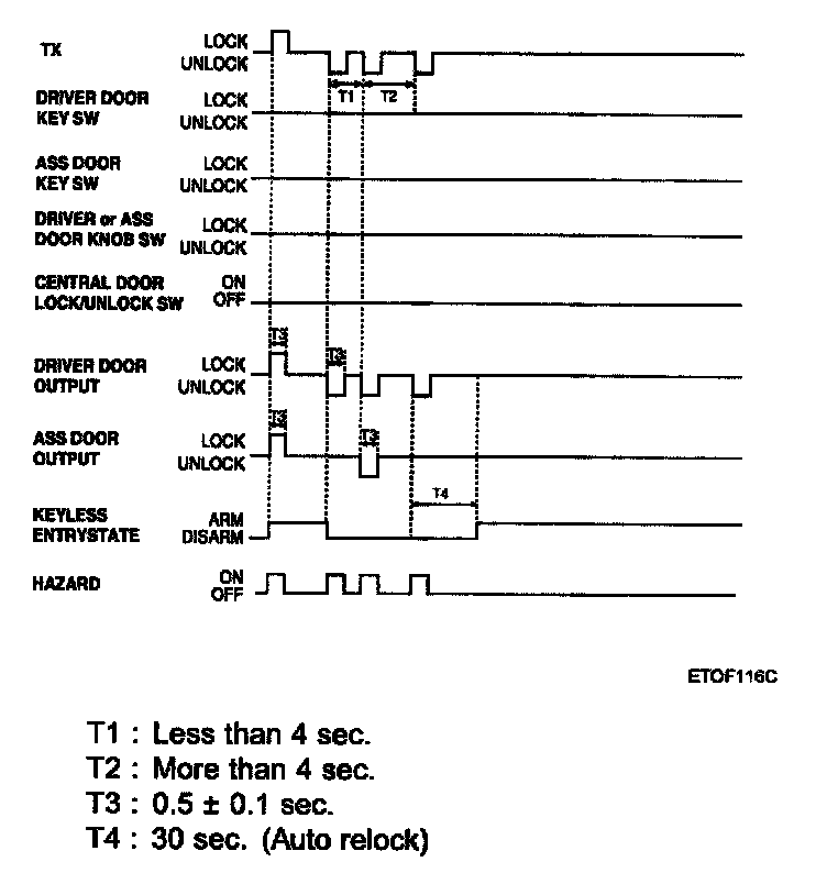 Then if an unlock command sent from the TX key is received by the BCM, and within 30 seconds no door, hood or tail gate has been opened or TX lock received, then the BCM will instigate a lock doors function and enter arm state. A single flash of the hazard lamps is given, period of cycle 2 second, duty rate 50 %.