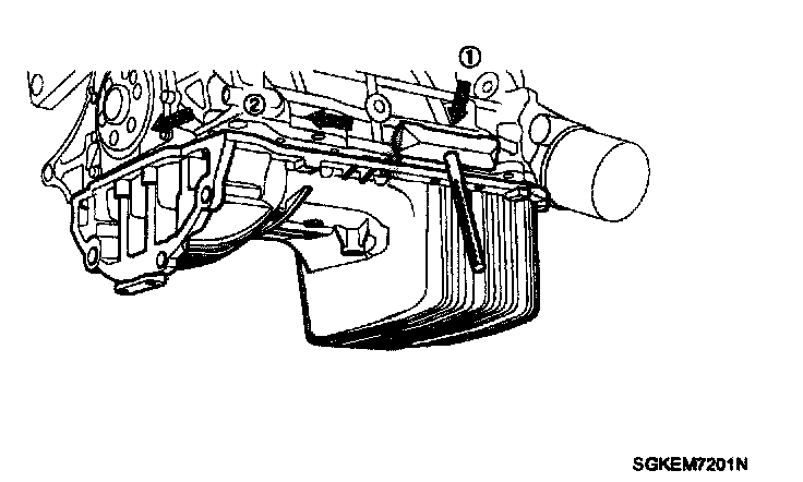 ^ Insert the SST between the oil pan and the ladder frame by tapping It with a plastic hammer in the direction of (1) arrow.