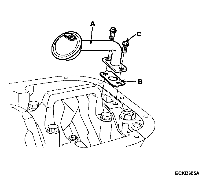 Remove the 2 bolts(C), oil screen(A) and gasket(B).
