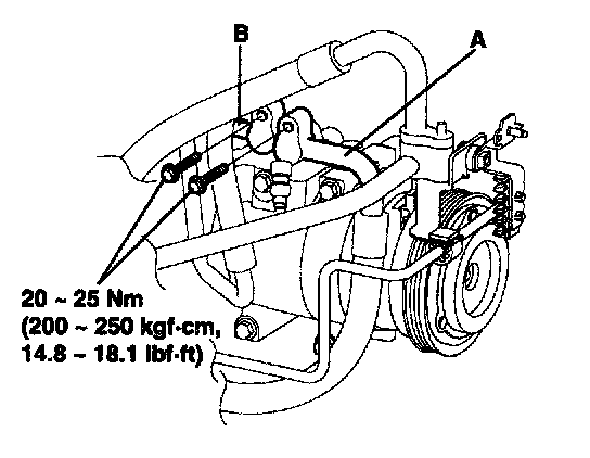 6. Disconnect the compressor clutch connector (A), then remove the mounting bolts and the compressor (B).
