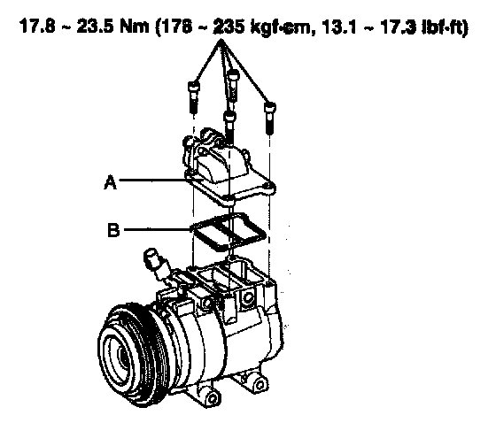 7. Using a hexagon wrench (6mm) remove the bolts, the manifold assembly (A) and the gasket (B) from the compressor.
