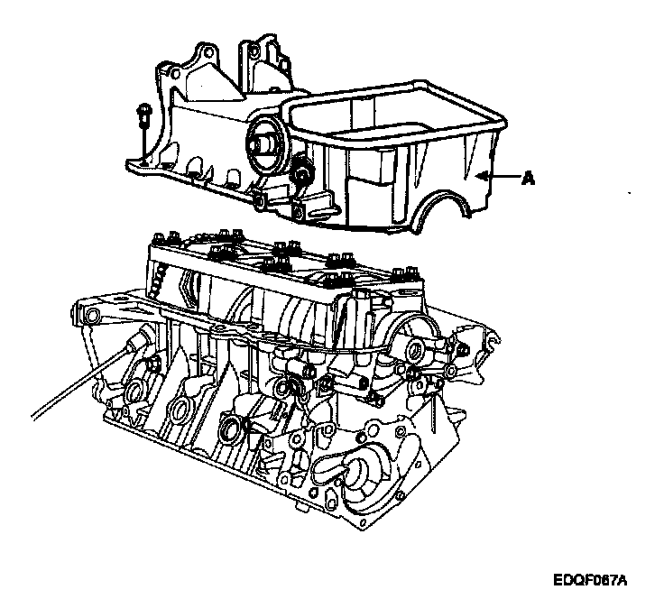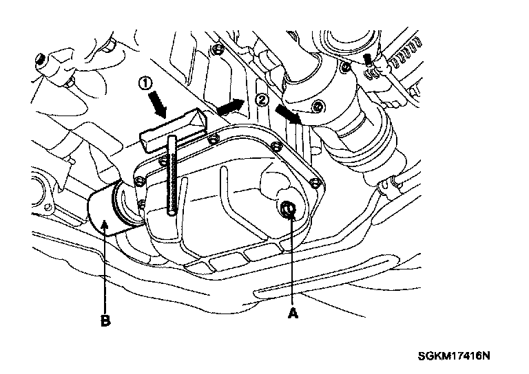 ^ Insert the SST between the oil pan and the ladder frame by tapping it with a plastic hammer in the direction of (1) arrow.