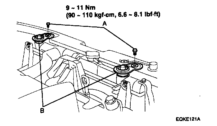 3. Remove the bolts (A), then remove the upper mount brackets (B) from the radiator.