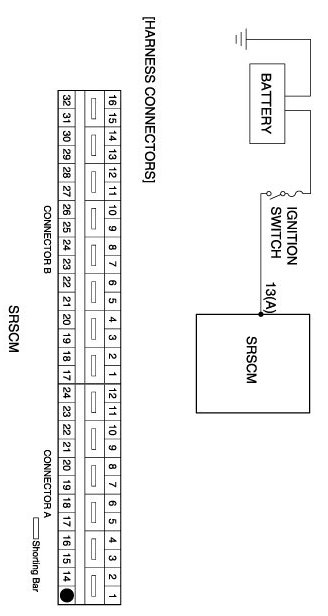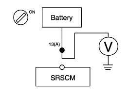 (2) Measure voltage between the terminal 13(A) of SRSCM harness connector and chassis ground.