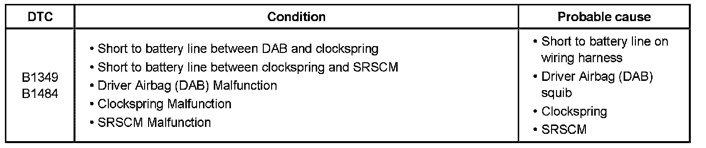 The SRSCM sets above DTC(s) if it detects short to battery line on the DAB circuit.