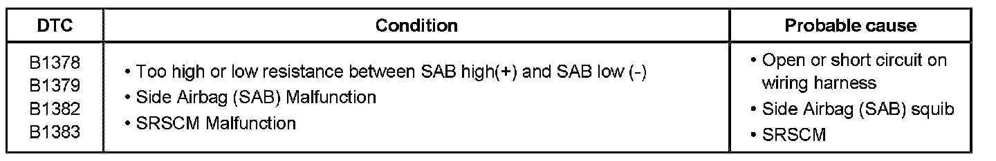 The Side Airbag circuit consists of the SRSCM and two Side Airbags (SAB). The SRSCM sets above DTC(s) if it detects