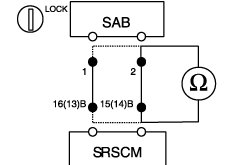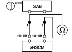 (2) Measure resistance between the terminal 1 of SAB harness connector and the terminal 16(13) of SRSCM harness connector(B).