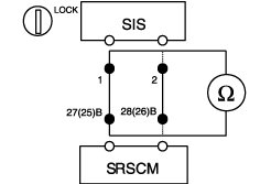 (1) Measure resistance between the terminal 1 of SIS harness connector and the terminal 27(25) of SRSCM harness connector(B).