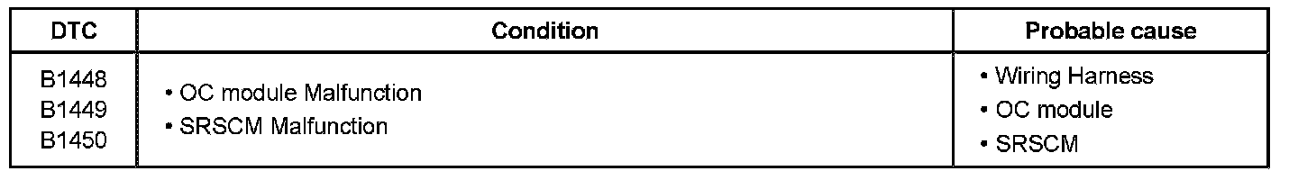 The passenger occupant classification (OC) system consists of the SRSCM and the OC module. The above DTC is recorded when a defect or communication error of the OC module is detected in the OC module circuit.