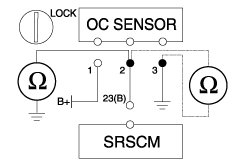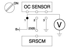 (1) Measure resistance between the terminal 2 of OC Sensor harness connector and the terminal 23 of the SRSCM harness connector(B).