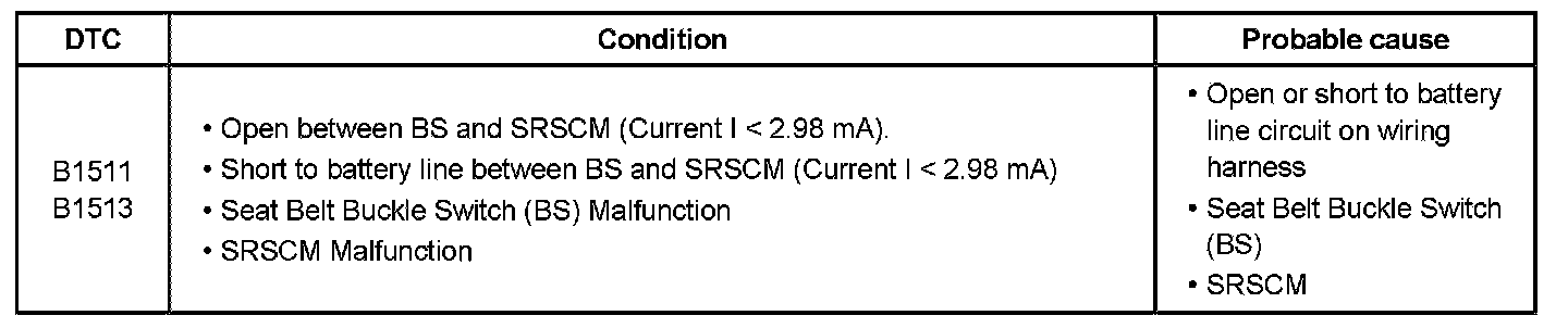 The Seat Belt Buckle Switch (BS) circuit consists of the SRSCM and two BS. The SRSCM sets above DTC(s) if it detects open or short to battery line on the BS circuit. This system decides whether the driver or passenger seat belt is buckled or not.