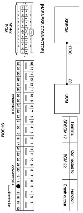 When a deployment of any restraint system for seat belt pretensioner and frontal and side air bags occurs, or when a rear crash is detected, the crash output is activated. The purpose of this output is to signal the BCM(Body Control Module) in the vehicle to unlock the vehicle doors. If a crash output is in progress, a second crash output signal will not be sent unless the first one is completed. The SRSCM doesn't perform diagnostics on the crash output function. After a frontal or side crash event is sensed and algorithm makes firing decision, above mentioned crash record is stored after squib deployment.