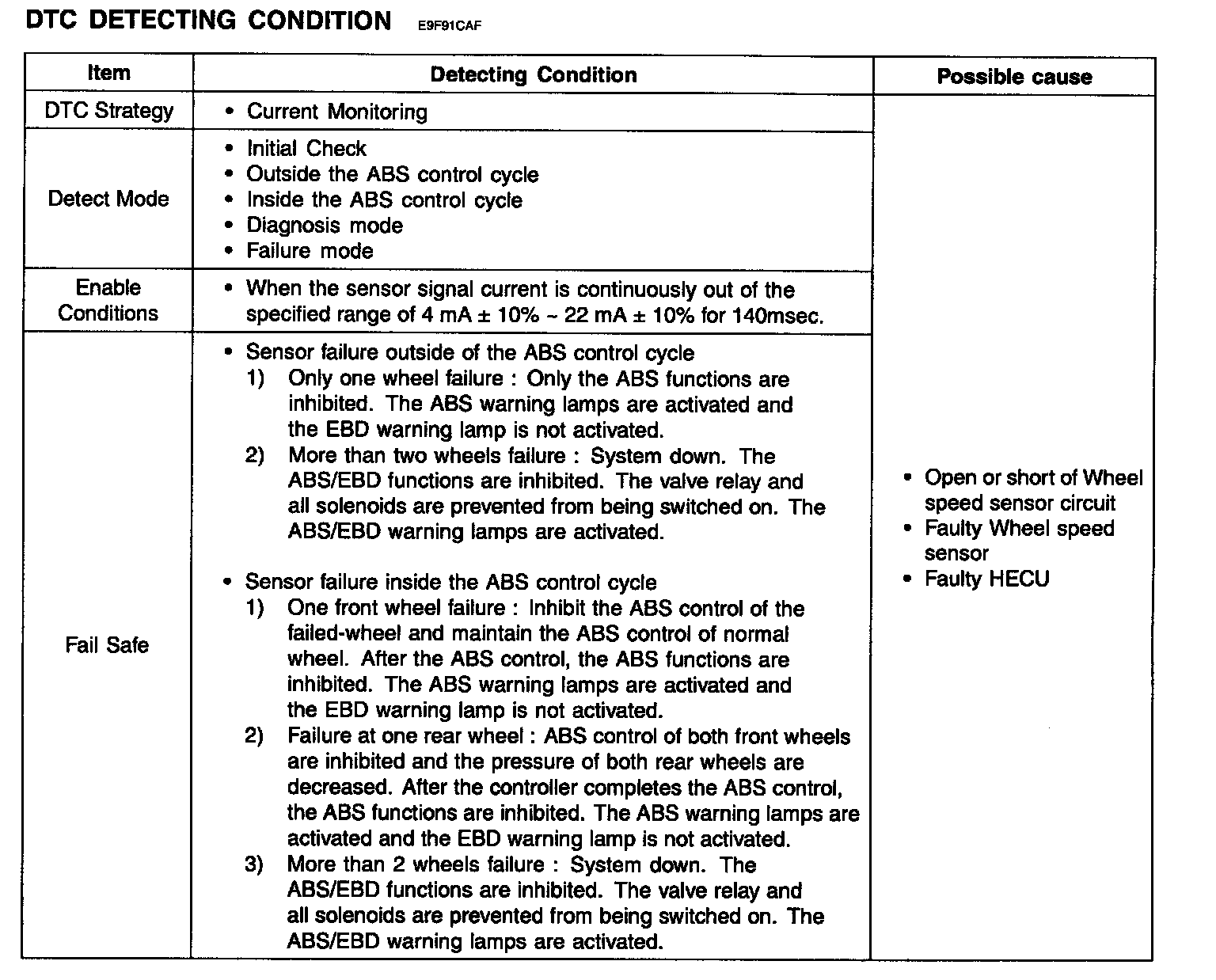 The ABS ECU monitors the wheel speed sensor circuit continuously If the sensor signal current is continuously out of the specified range for 140 msec, then the HECU determines that the circuit is open/short, and sets this code. Warning lamp is turned OFF if the detected fault is not more than when the IG KEY is turned to ON again, and wheel speeds are more than 6.21 mph.