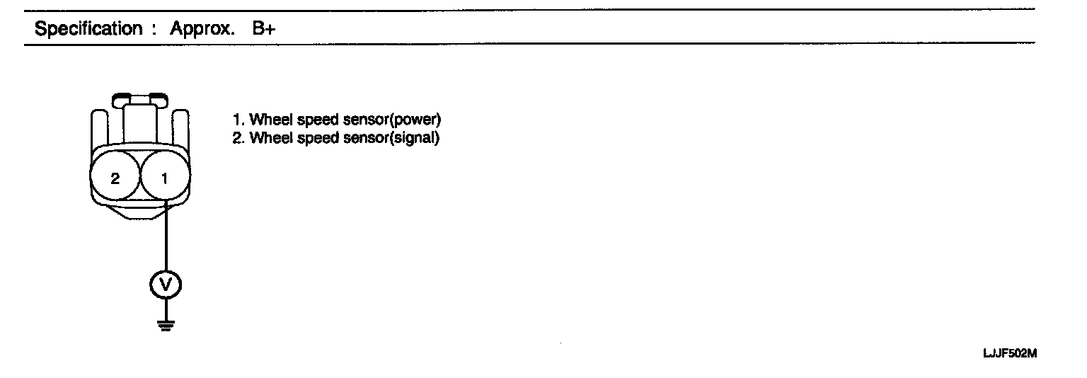 2. Measure voltage between terminal "1" of the wheel speed sensor harness connector and chassis ground.