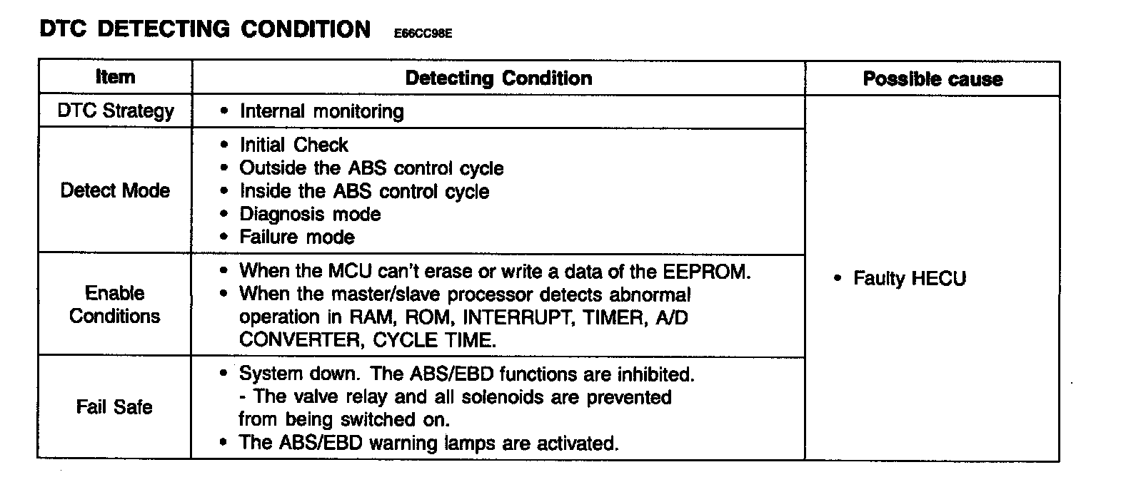 The HECU monitors the operation of the IC components such as memory, register, A/D converter and so on. The HECU sets this code when the EEPROM data read by the master processor is different from prior data written, or when the master/slave processor detects abnormal operation in RAM, Status Register, Interrupt, Timer, A/D converter or cycle time.